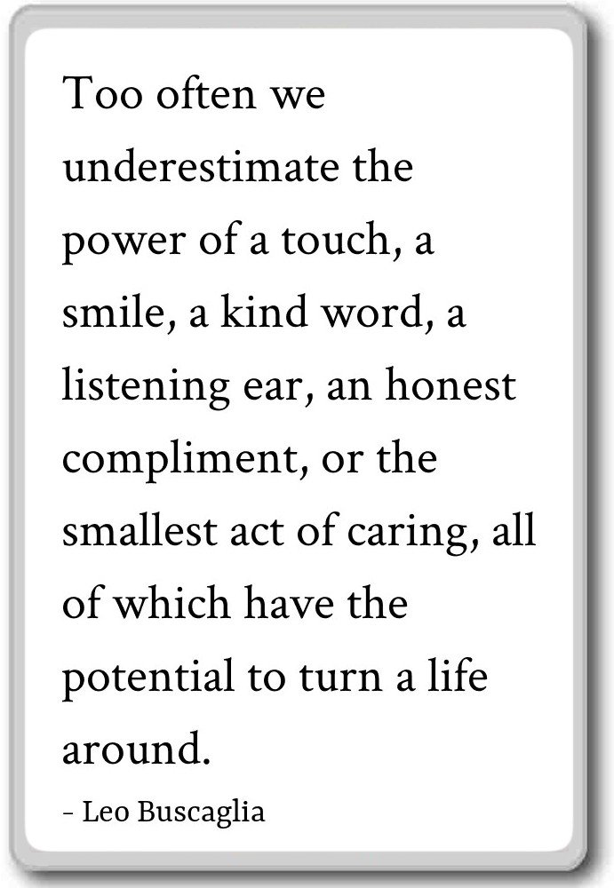 Learn more Too often we underestimate the power of a touch a smile a kind word a listening ear an. Leo Buscaglia Too often we underestimate the power of a touch a smile a kind word a listening ear an honest compliment or the smallest act of car. Illustration of a Quote by Leo Buscaglia -- Too often we underestimate the power of a touch a smile a kind word a listening ear an honest compliment or the smallest act of caring all of.